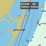 well I pardon my grammar I know the capitalization is not so great but this is voice to text so that's the way it is I may go back and correct it later it's kind of a pain. in any case in this screenshot if you click on the small image to get to the larger image you'll see the red line is my lover line that's the direction I'm pointed in and you see the boat at the end of that red line and behind me is the yellow line that's where I have been and then next to that is a line with two dots at either end and that's the distance and bearing to Caesar Creek that allows me to get into Biscayne Bay and out of the ocean I may just do that I'll make that call when I get there but we see that it's about 20 miles and I'm doing five and six not so it shouldn't take too long in 4 hours like after lunch I'll get there and decide whether to go up the outside to Miami in hawk channel in the Atlantic or go to the inside and Biscayne Bay through card sound